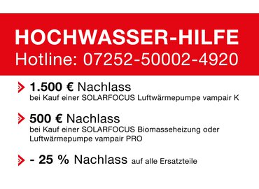 War auch Ihre Heizung vom Hochwasser betroffen und muss repariert oder ersetzt werden? Wir möchten sie unterstützen! Für Reparaturen setzen Sie sich bitte mit unserer Servicehotline unter Tel. 07252 - 50002- 4920 oder per Mail unter kundenservice@solarfocus.at in Verbindung! Wenn Sie eine neue Heizanlage kaufen müssen, erhalten Sie einen speziellen Rabatt!