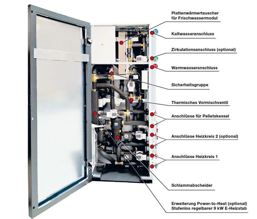 Der hydroPELL überzeugt durch hohen Vorfertigungsgrad bereits bei der Auslieferung: Die Edelstahl-Verrohrung ist vollständig isoliert, alle Pumpen und Ventile sind vormontiert und elektrisch angeschlossen. Kugelhähne, ein Schmutz- und Schlammabscheider sowie die komplette Kesselsicherheitsgruppe sind ebenfalls serienmäßig enthalten.