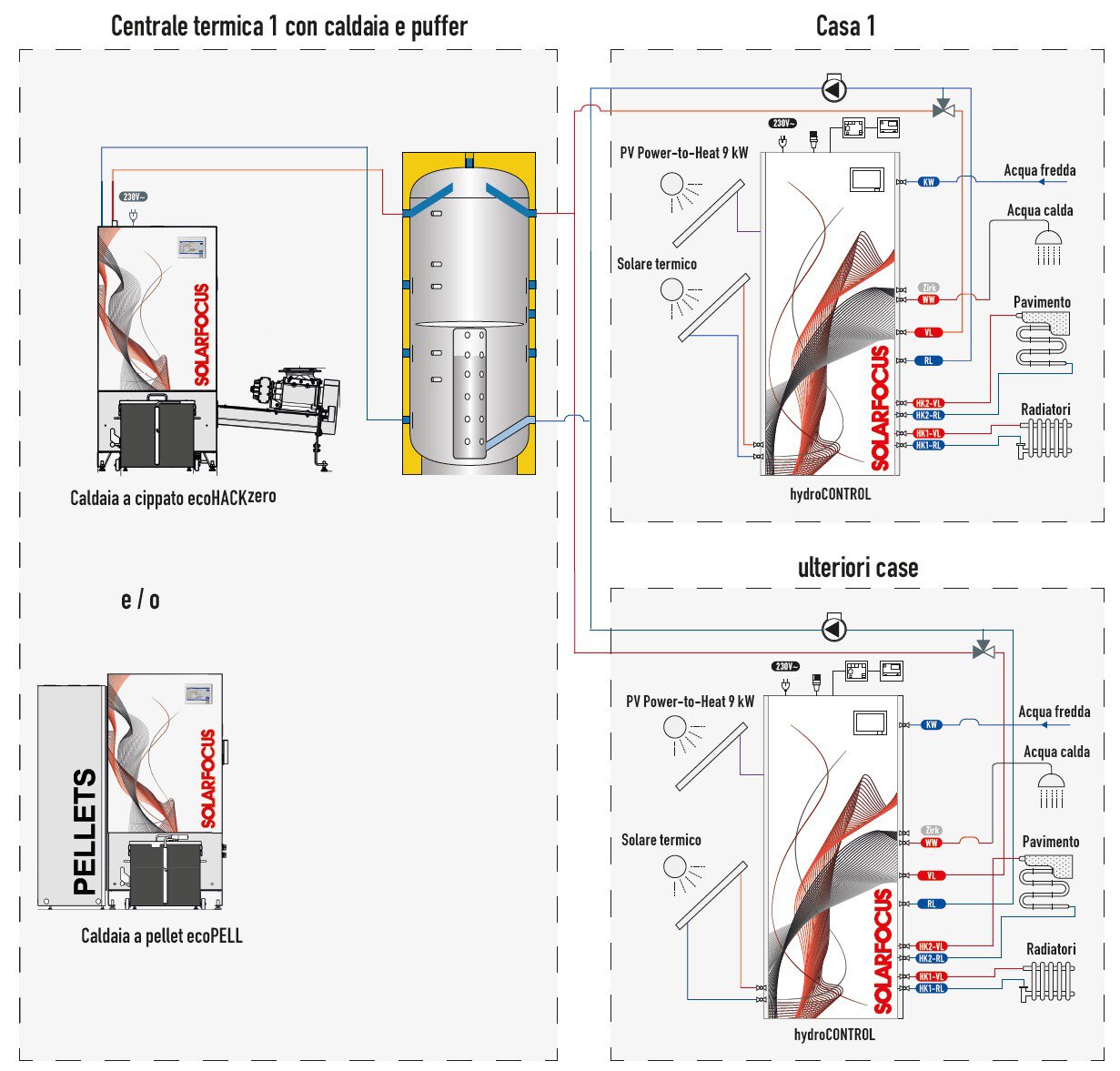 Inoltre, hydroCONTROL è la scelta ideale per le moderne reti di teleriscaldamento a breve e lunga distanza. In una centrale termica vengono raggruppati i generatori di calore e un grande serbatoio di accumulo – il cuore energetico per complessi residenziali